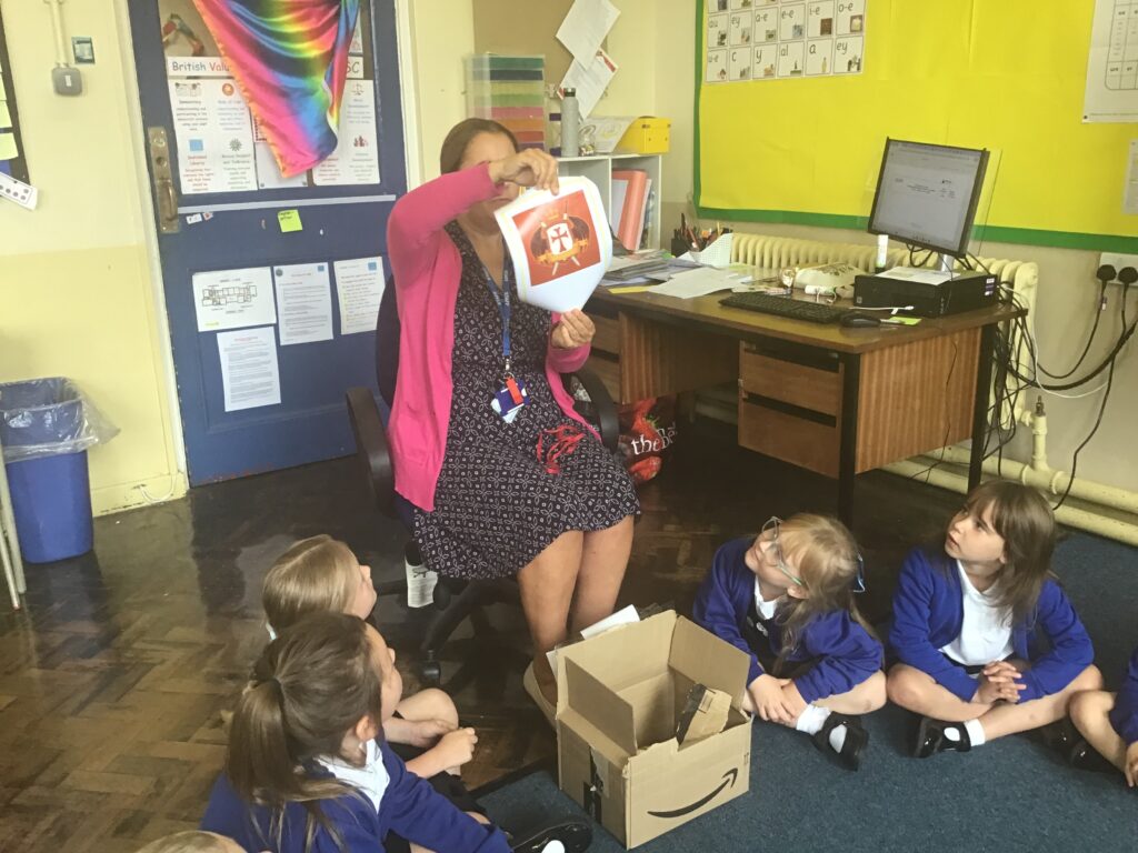 This week, we were given some clues about the book we were going to be using in English. A parcel arrived in our classroom addressed to 2H and 2T. Inside was a scroll with a message on. The sender asked us to keep the contents safe for now and had old fashioned words like ‘Hear Ye, Hear Ye’. It was signed ‘Yours Royally’ so we thought there might be kings or queens in the story. There was also a pair of golden underpants! We thought they were very funny. They reminded us of the story ‘Aliens Love Underpants’ by Clare Freedman and Ben Kort. There was also a sword left in 2H and as we listened to some music we decided there must be fighting in the story too. Finally, we had some clues which helped us to find some puzzle pieces around the room. When we put these together we had a book front cover.