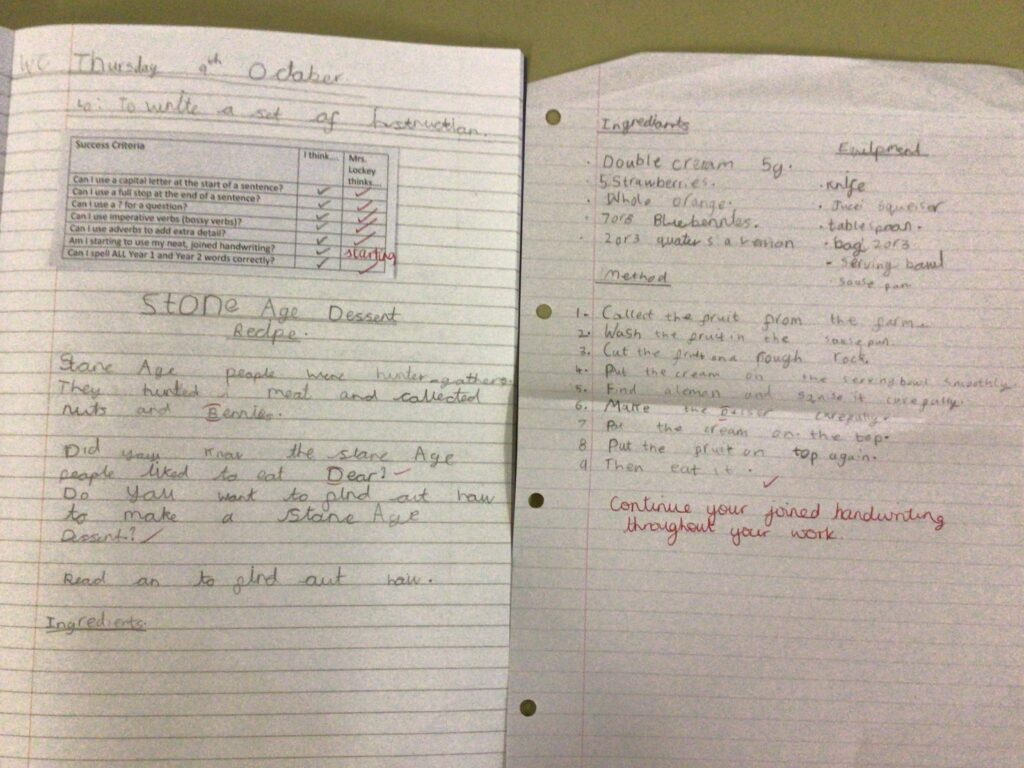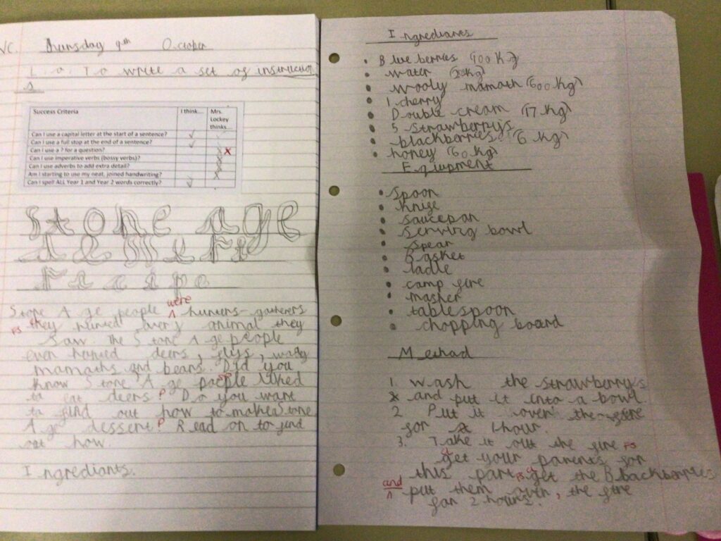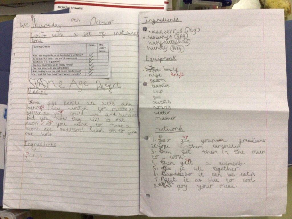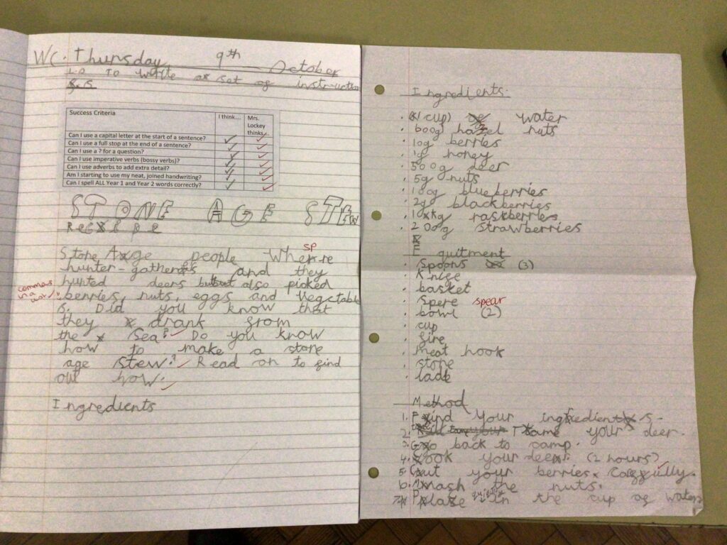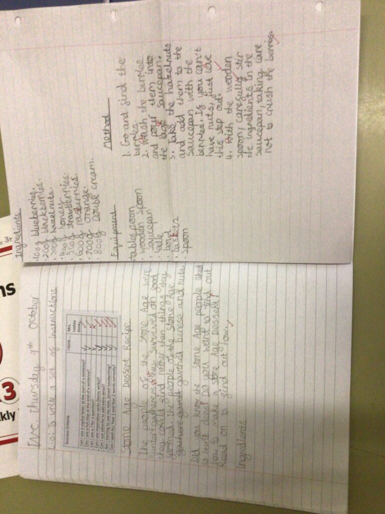 This week we have been looking at a non-fiction text called ‘The Stone Age; Hunters, Gatherers and Woolly Mammoths’ by the author Marcia Williams. We have been learning about the Stone Age in History therefore this book solidified our knowledge of this time period. In English, we have been using the text to write our own instructions on how to make a Stone Age Stew or Dessert. During the week, we discussed the use of imperative verbs and adverbs in our instructional writing. Take a look at some of them….