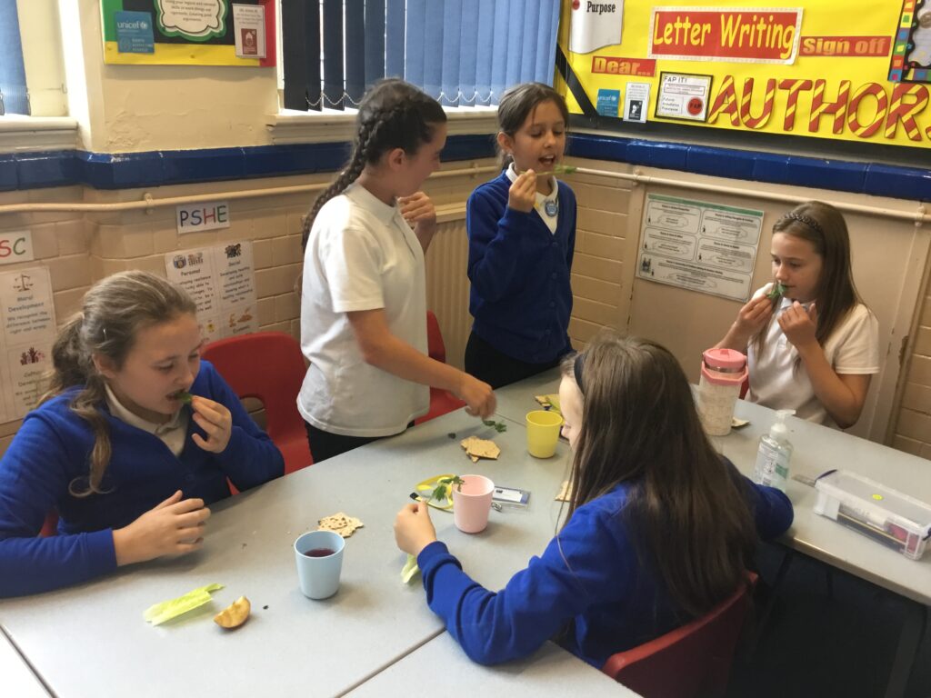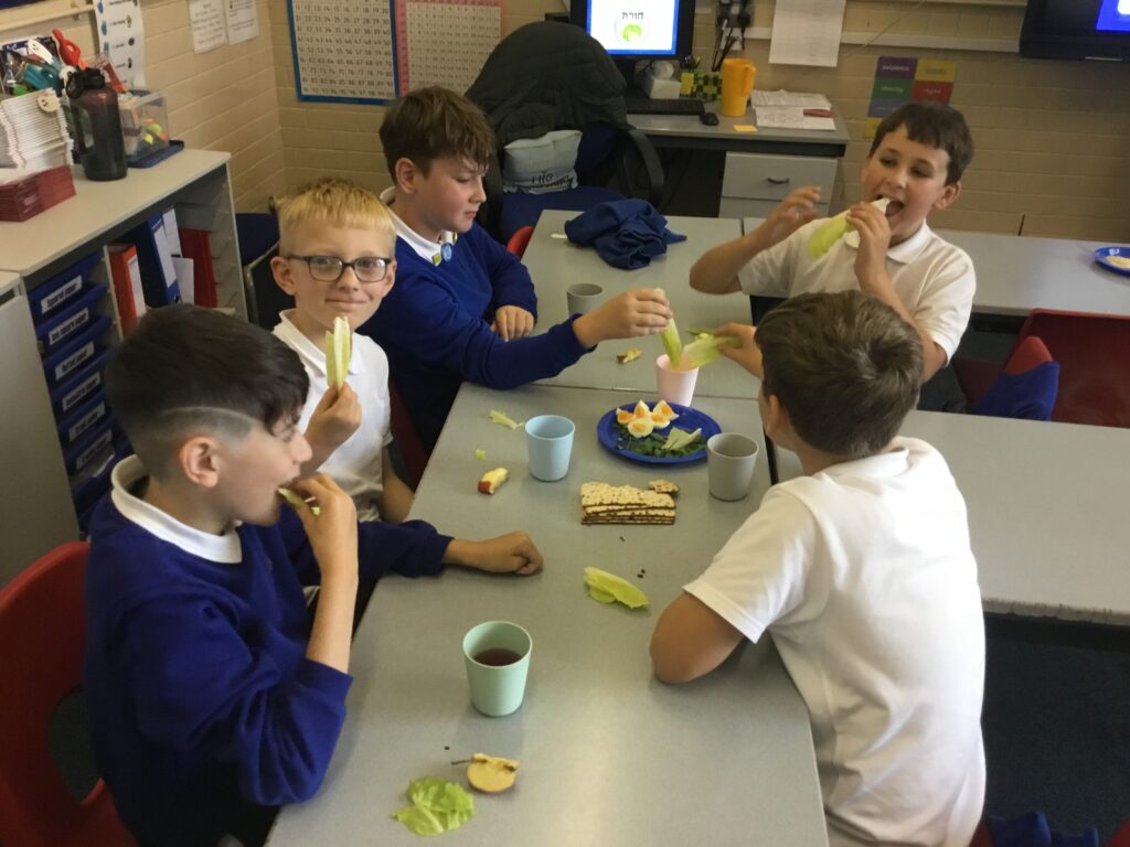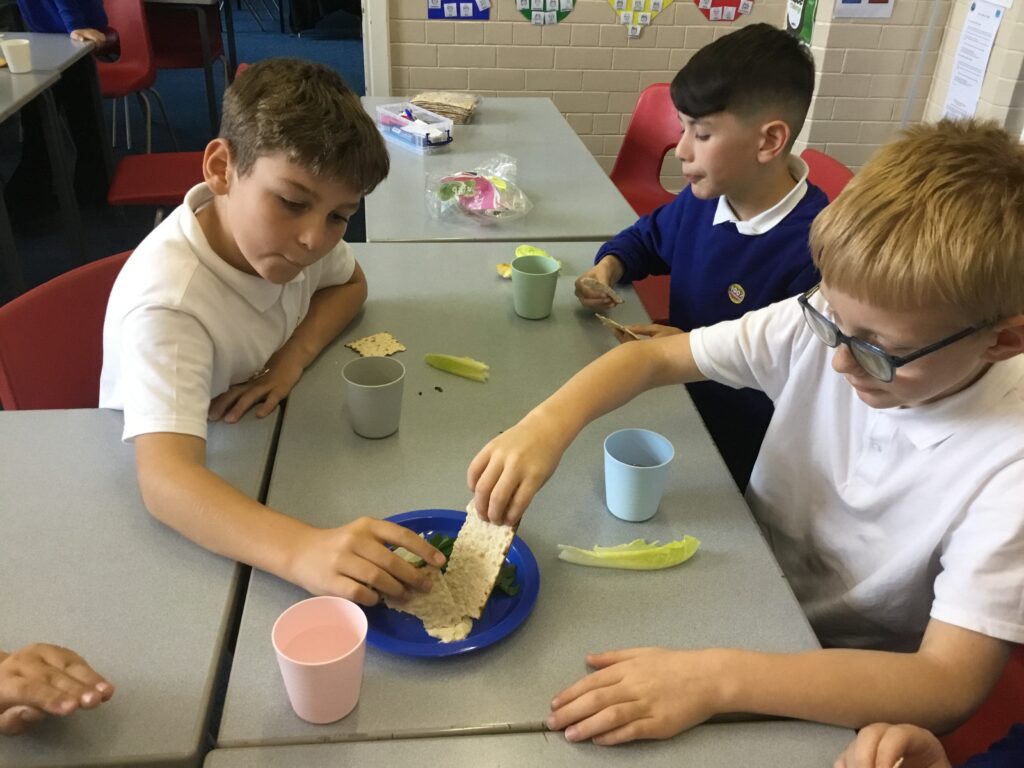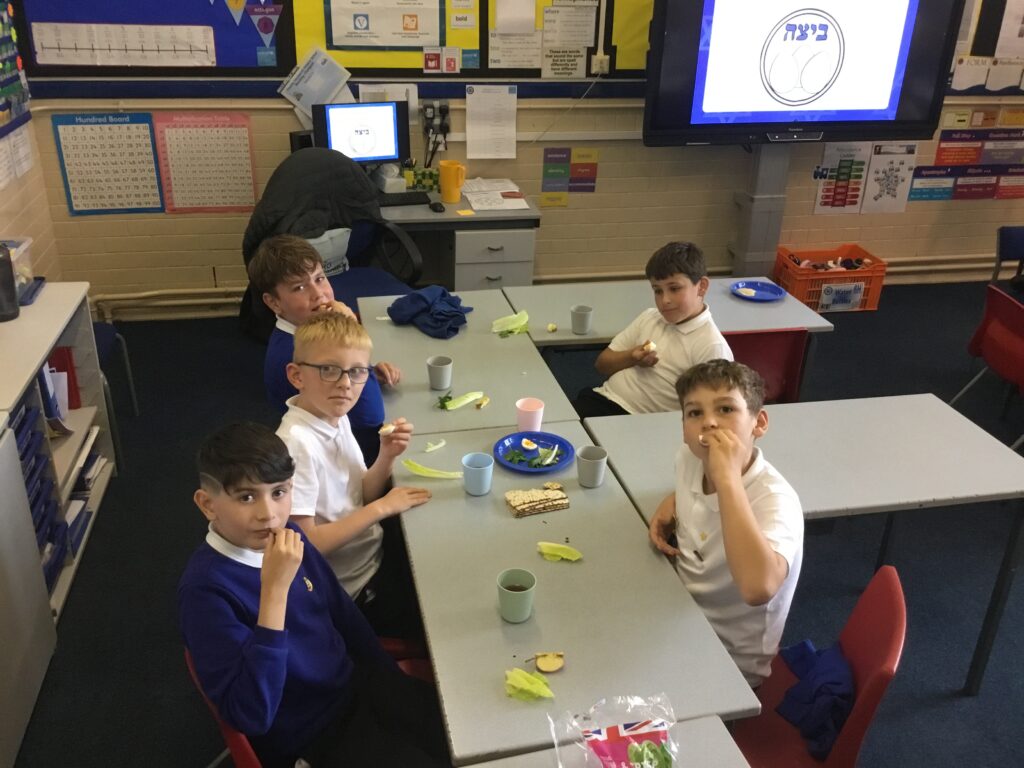 Year 6 have been studying a unit of work on rituals that come from different religions. So far this term, we have studied the Christian ritual of The Eucharist, the Islamic prayer ritual of Salah and this week we looked at the Jewish ritual meal of Pesach (Passover). We identified the different foods and what religious meanings they have to some Jewish people then we tasted the different foods that make up the Seder meal plate. Some of the tastes were very bitter or salty to represent suffering or tears, but this didn’t put the children off trying them.